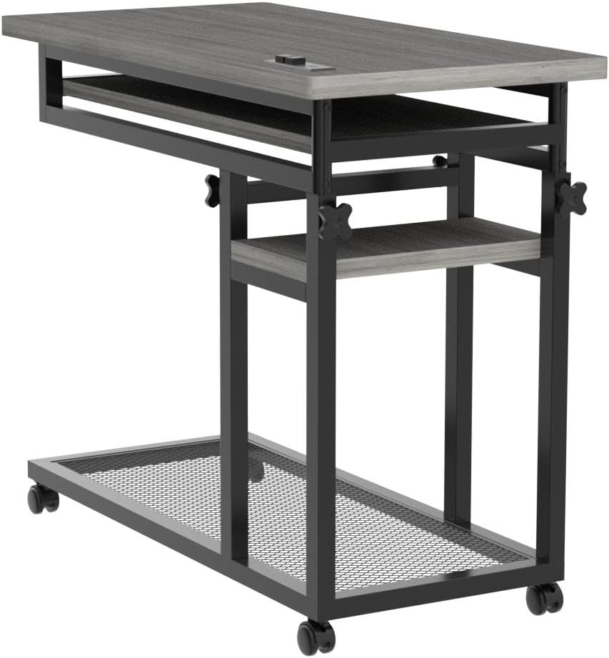 Review: I wanted a table on wheels that I could use sitting or standing. I also wanted to be able to use it at a couch or bedside if I wanted to. Love the outlet and sliding keyboard. Also love the storage. It was easy to put together. It’s a little hard to adjust up and down, but that’s to be expected since it’s not electric – you have to do the work yourself. Keyboard tray could move a little smoother but is ok if you lift and then pull. Love the sleek black finish.