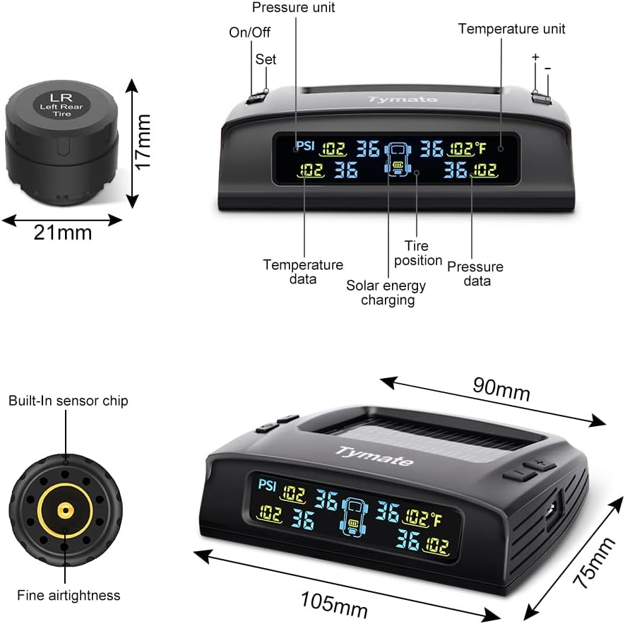 [Versatile Charging Options]: The Tymate Tire Pressure Monitoring System TM2 features solar automatic charging capabilities, ensuring continuous power supply. Additionally, it offers flexibility by supporting charging via USB port or cigarette lighter socket (adapter not included) when sunlight is unavailable. This ensures you can stay focused on driving without worrying about TPMS battery levels