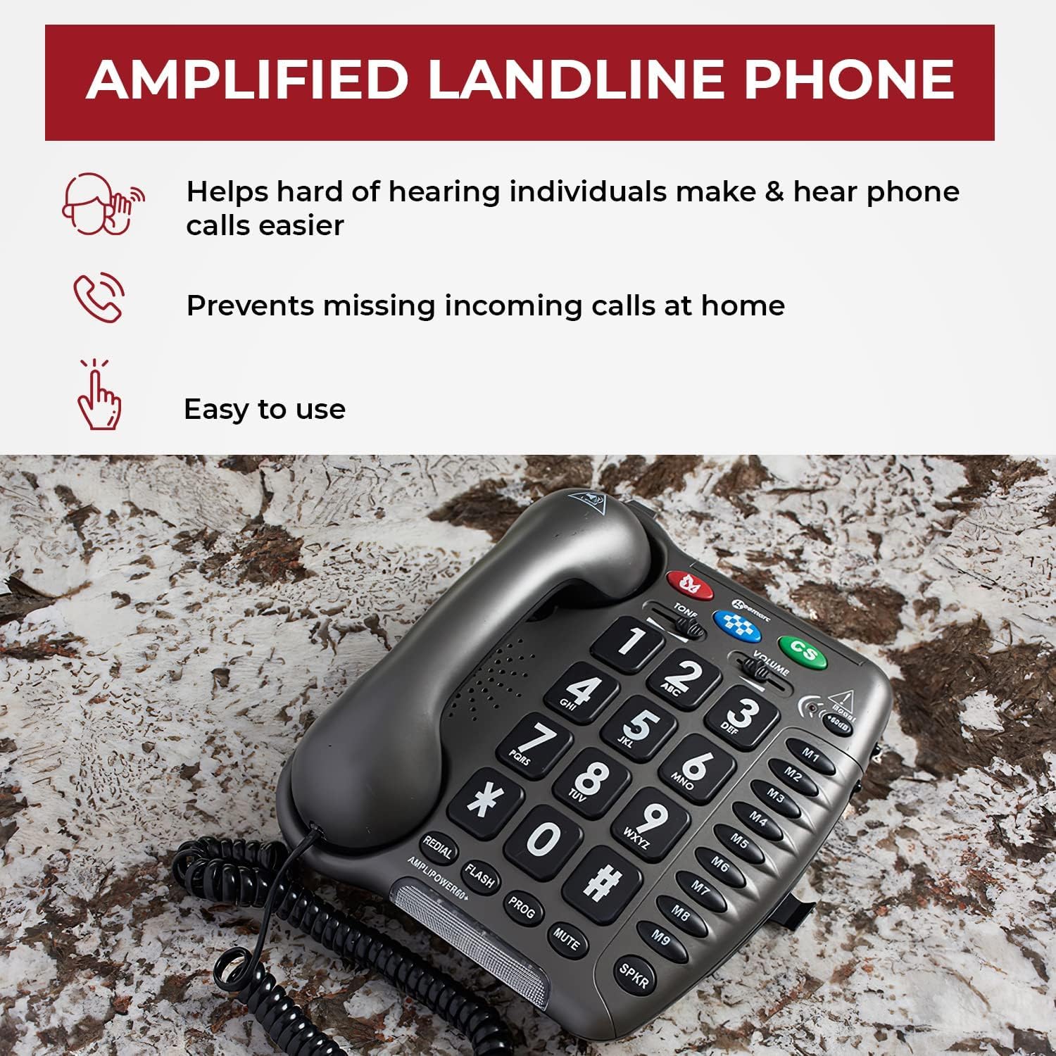 πππ ππππππππ πππππ: Sonic Alertβs AMPLIPOWER60 Amplified Telephone is specially designed to be easy to use, help hard of hearing individuals make & hear phone calls easier, & prevent missing incoming calls at home again. It has a loud ringer, extra bright flashing incoming call strobe notification, & an extra-large keypad with easy-to-read numbers & 3 emergency keys.β