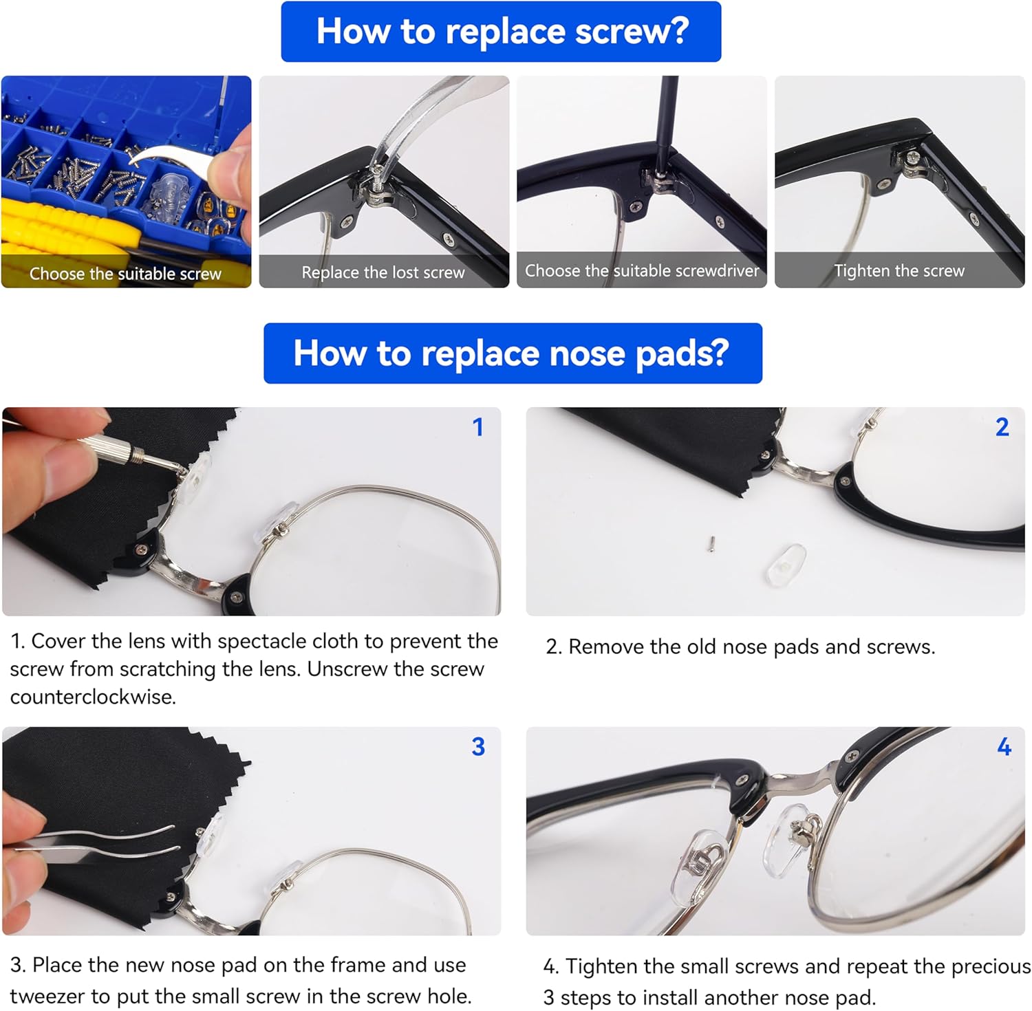 Review: This is a pet comprehensive kit. Various types and sizes of screwdrivers and a bunch of screw sizes and nose piece sizes.If you are looking to fix your classes or even just update the nose pieces, this kit is worth it. The screw drivers alone make it worth it