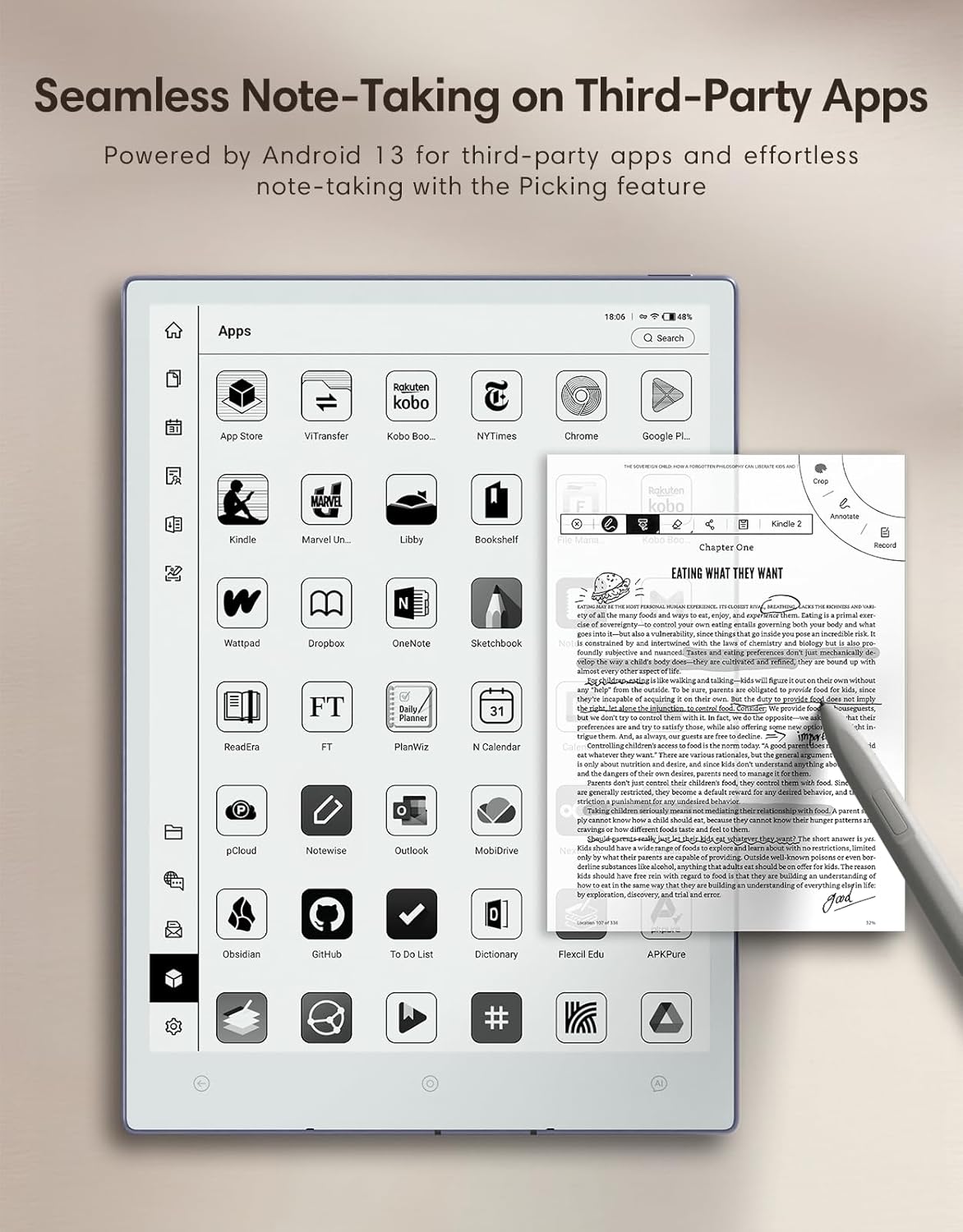 Review: After researching various e-tablet makers and products, watching at least a dozen or more YT reviews and comparisons, I was ready to finally try e-ink. Many reviewers (various brands) I saw featured comic strips, ghosting issues prominently – but wait, for me at least, at 600$ who buys this to read comic books? My use case is more hard-core professional software and cloud engineer. It has to be useful and many use cases. So their reviews I thought didn’t make sense. But I decided to keep researching, at first I thought I was leaning towards Boox – however the pricing and the add-on purchases didn’t compare to the value the Viwoods brings. For this price, I think you get a great stylus with lots of nibs, and the tablet and writing experience is fantanstic for what I do – take notes, draw software and infrastructure diagrams, draw building plans (for home improvement DYI projects). The icing on the cake was the Android and Google Play integration, I had not seen anyone going in depth about using some of my daily apps – Yahoo finance, online technical libraries, gmail, cloud storage, magazine subscriptions- in short multi-tasking when I needed to. Now I can work outside in the sun and less time behind my desk, I carry this around everywhere and keeps me focused. Battery life is very good too I find for me I can work on it regularly and the charge lasts almost a whole week. I use chatgpt fairly often to prototype stuff, so the Ai button is nice but only has 4.0 support not the latest openai 5 model, but I still use the Ai button some. The handwriting recognition is “meh” because my writing is too fast and a bit sloppy, so I use it less. I find When I want Chatgpt 5 I just go to the chrome browser and work in there as usual. Finally, the Android upgrades keep coming! It’s patched and updated more often than a Windows OS, so my verdict – top of the list recommendation for anyone who needs more than just sketching or drawing and needs cloud integration to get the most use and best value for money. I’ve learned how to use the notes and “Picking” whch took a minute to figure out, but is easy and not too complicated. I wanted somehing that was not overly complicated, and could sync to my google and integrate to cloud. I’m always bouncing between laptop and this, I like the Google play support i can upload code to my “git” via the android git client and continue to work on it on my laptop seamlessly. The only “meh” I would have is minor, I admint, but the name is just.. a little strange -“viwoods”, really? How do you even pronouce it, or come up with such a name? I dunno, but the I do admit I was suspicious at first just because of the name is just … weird. But now, I know the product and it is really a very useful e-ink tablet at fair price.