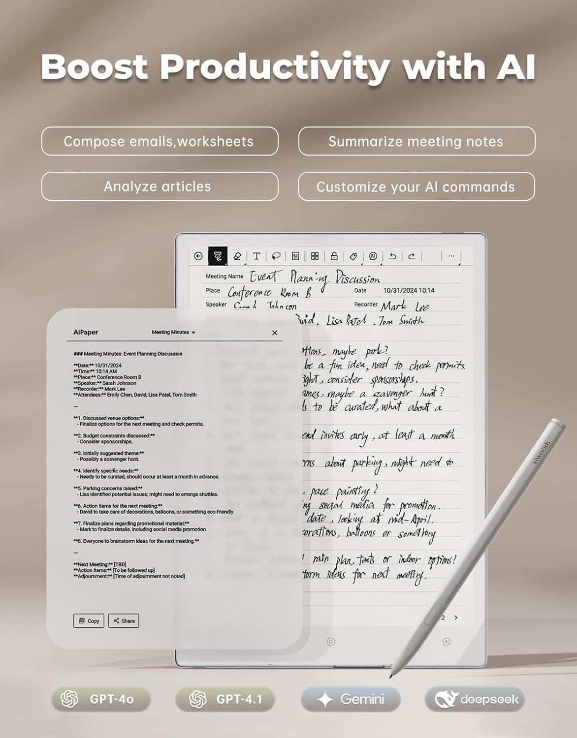 Review: I’ve waited for years for a product like this. I still have papers in a box from the last 12 months where I jotted my notes that I need to sort through. This Viwoods now keeps everything in one place digitised. I particularly love the layout where I know where my tasks are, where to find meeting notes and where I’ve committed to people and where my brainstorming ideas are. I love the AI buttons. Imagine collapsing several steps – opening laptop/phone, launch browser, type question and determine best answers – into one? I’ve asked questions like- compare market capitalisation of company A and B- explain the difference between cabinet, inner and outer ministry in Australiaand bam! I got my answers within 5 seconds.I have a few ask- colour version- easier to work on documents on drives right away (this one possibly due to inexperience)