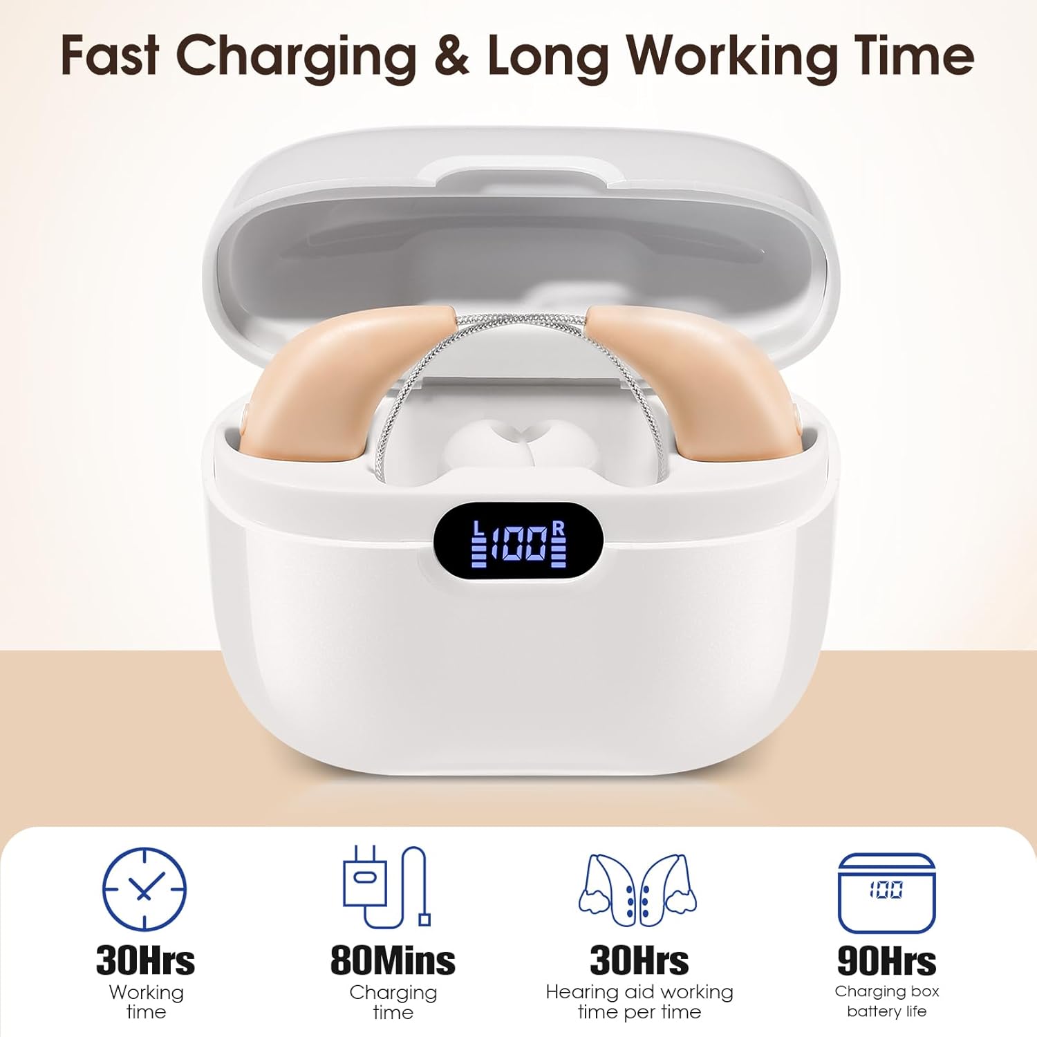 Review: This hearing aid works very well and is simple to set up. The sound is clear, and the noise canceling helps a lot in busy places. It feels comfortable behind the ear and stays in place all day. The rechargeable case is very helpful, and the display shows the battery level, so you always know when to charge.