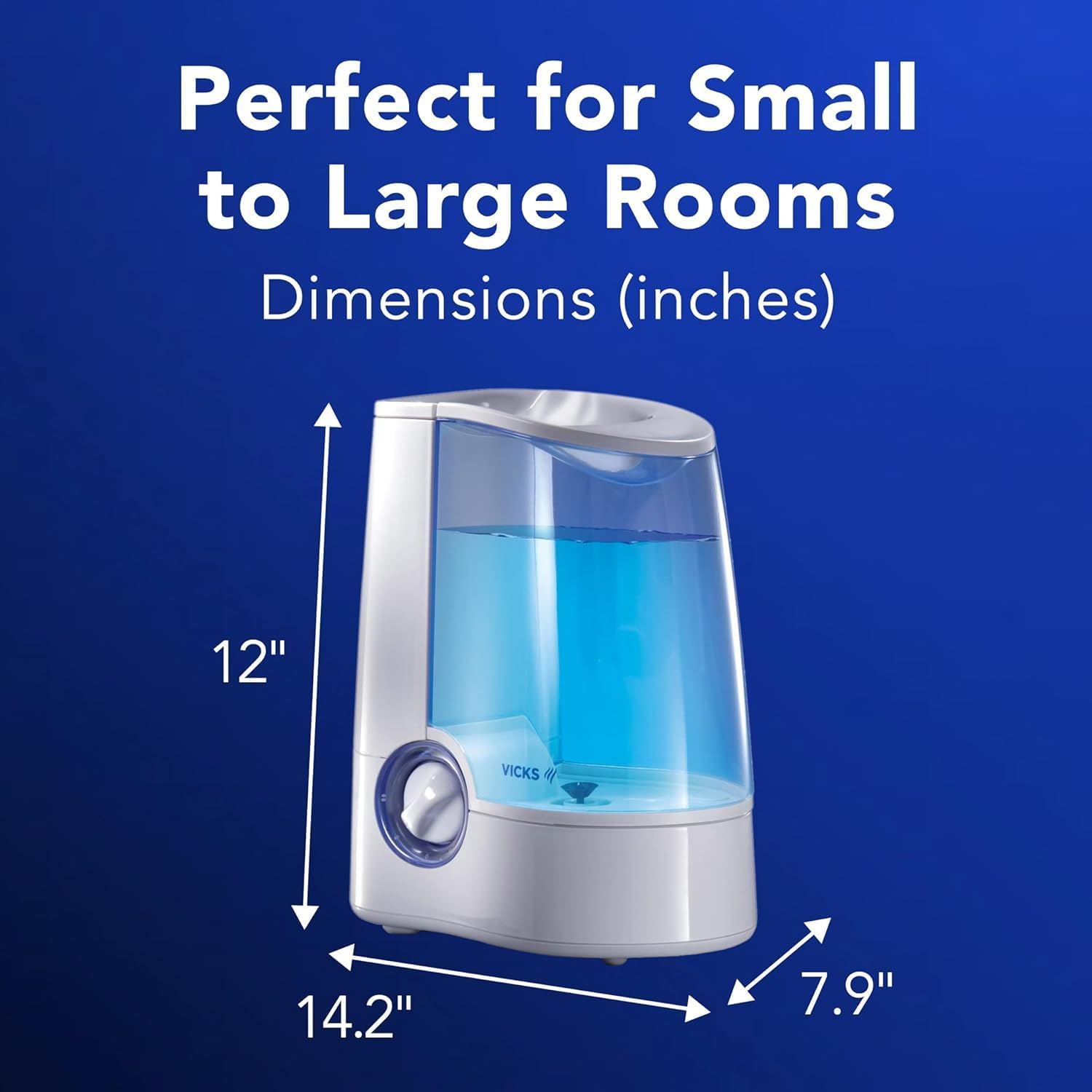 Portable, Easy to Use and Clean - With a top fill, 1 gallon tank providing 24 hours of use in a small or large room up to 600 sq. ft, an auto shut-off feature, and no filters to replace, Vicks vaporizer humidifier for home is designed for simplicity