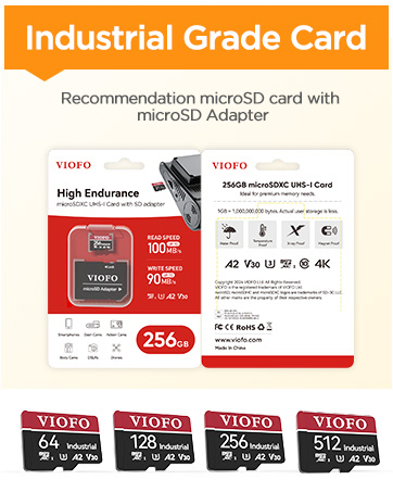 【Optional Memory Card Recommendation】 VIOFO industrial high endurance microSD cards, optimized for dashcam recording, give greater assurances around compatibility and long-life durability, greatly elevating your dashcam owner experience. There are different options for your choice - 64GB/128GB/256GB/512GB. (*NOT Included. Please separately purchase it in VIOFO store.)