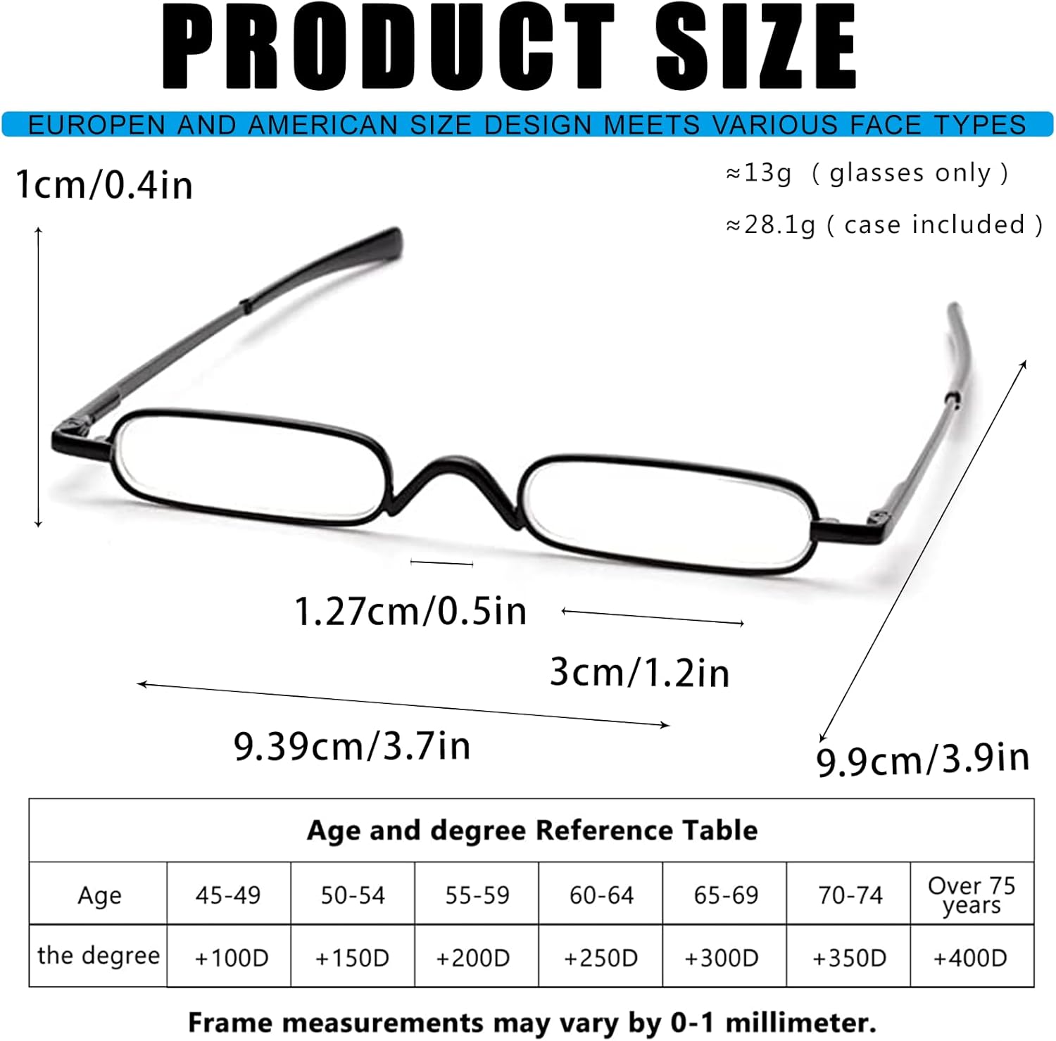 Review: I only need glasses to read. When I go shopping, I need my reading glasses to read the small print on labels. I have always thought that having to carry my glasses around, in it’s case, a real pain in the butt because of the size of the case.I love these reading glasses because of the compact size. You can clip it to your shirt pocket or put them in pant pocket and you don’t even know you have them. Very practical. Excellent!