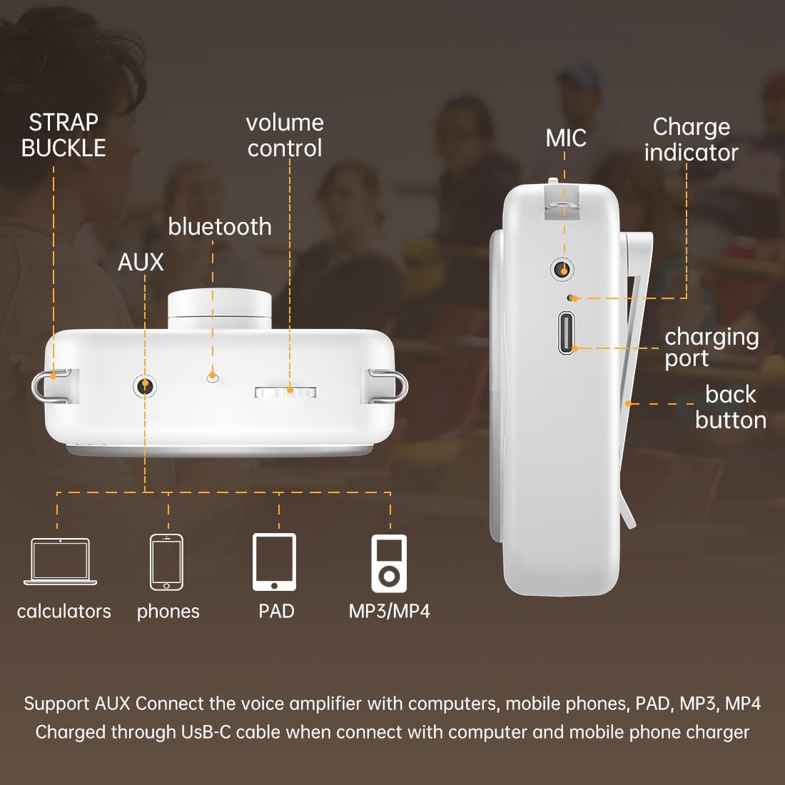 Review: I ordered this for a family member that is into Halloween and they are going to use it with a voice changer for some costume they are making. I tried it out just to see how it worked and it isn’t super loud and if the mic gets too close to the speaker you will get some feedback but as long as it is hanging around your neck and away from the headset there were no issues. It is responsive but the voice does have like an echo and distortion to it so I’m not sure how it would work in a classroom but for it is going to work for my cousins costume.