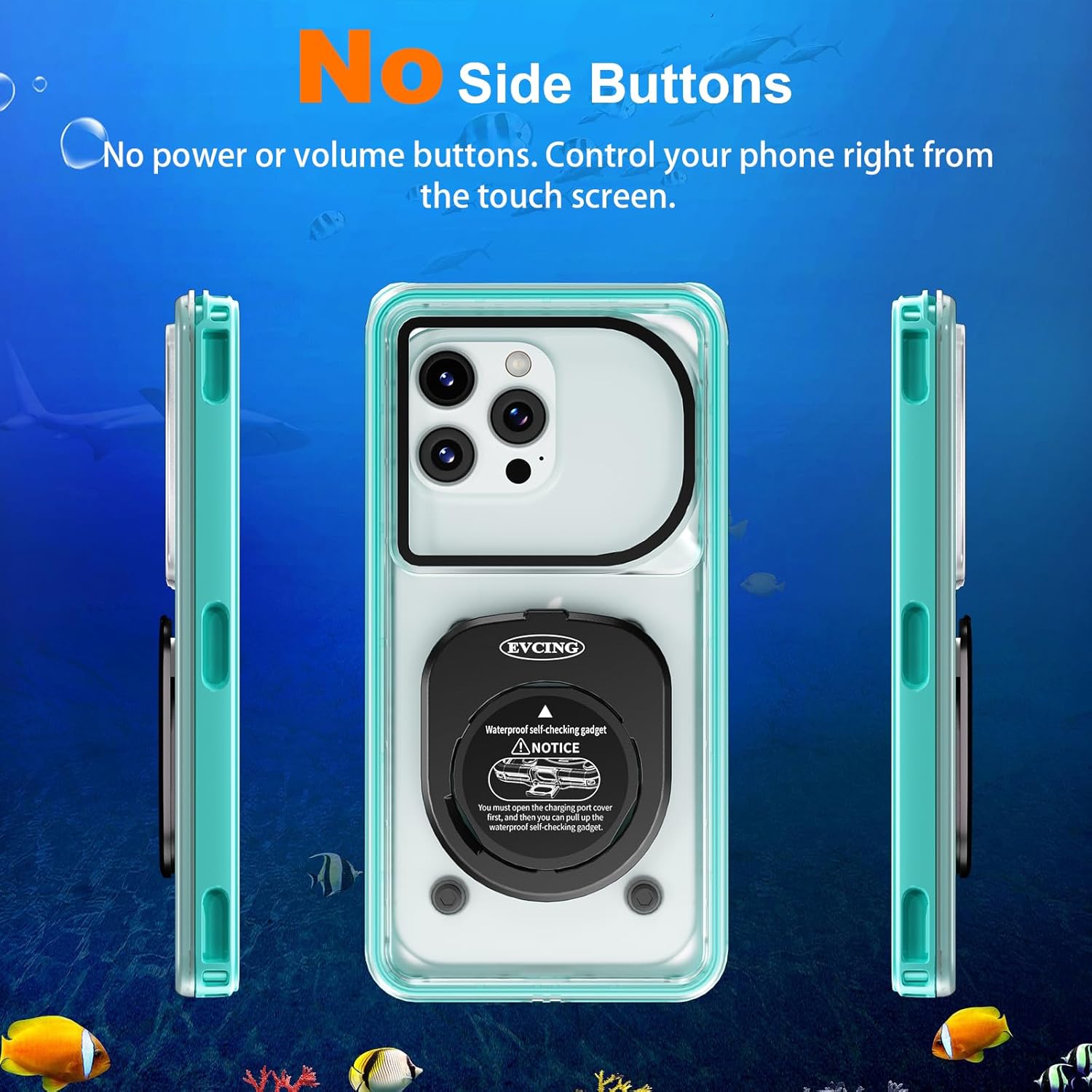 Underwater Touchscreen Sensitivity: Our Evcing snorkeling diving phone case has been rigorously tested for reliability, guaranteeing touch sensitivity at depths up to 5 meters underwater. On land, boost sensitivity by lifting the self-check cover. Enjoy seamless access with support for Face ID and password unlock. The snorkeling phone case has no side buttons; instead, use the 'Wake-up' function for convenience