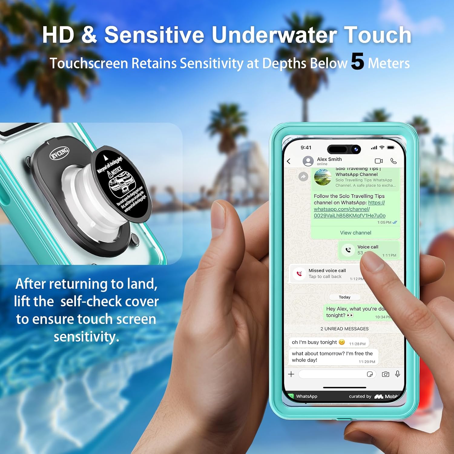 Patented Self-Check Waterproof Technology: Experience peace of mind with our patented Evcing underwater phone cases for snorkeling, featuring unique self-check waterproof technology. Simply squeeze the self-check cover and tap the screen's soft film—if bulges don't dissipate, it confirms a perfect seal, ready for your underwater adventures