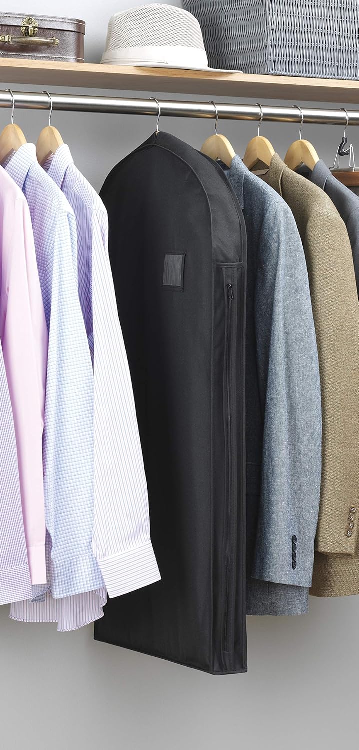 Easily transport shirts, slacks and suits with Whitmor's Deluxe Suit Bag. Constructed of heavy-duty, water-repellant, easy wipe clean polyester, this bag is ideal for travel. Sleek and sophisticated in all black, equipped with front ID pocket to easily organize & identify garments and self-correcting side zipper.