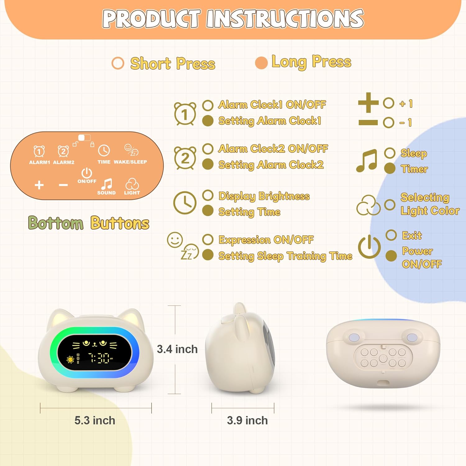 Kids Clock with Sleep Sound: Offering 7 soothing sleep music options and 6 gentle alarm sounds to choose from, this alarm clock provides a peaceful and enjoyable waking experience for your little ones. The intuitive design of this alarm clock encourages independence and self-sufficiency in managing their sleep routines. Help your child wake up refreshed and start the day with enthusiasm. Promote healthy sleep habits and ensure a smooth morning routine with the sleep trainer clock