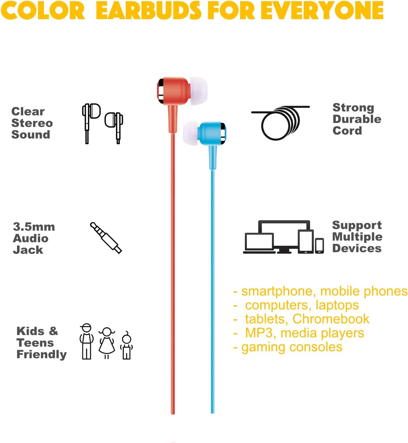 Wholesale Bulk Pack - 10 pack of earbuds headphones with stereo sound in 8 assorted colors, including black, blue, green, red, pink, purple, yellow and white.In-the-Ear Noise Isolation - With soft silicone ear tips and in-ear headphones design, these earbuds provide good noise isolation environment for you to enjoy music, video and podcast.Light Weight and Compact - These earbuds are designed in a compact shape and light weight so they are easy to wear for longer time.Wide Compatibility - The 3.5mm audio headphones jack aux interface widely compatible. Simply plug in and start listening right away. No more fuzz pairing to you wireless Bluetooth headphones.Multi Size Earbuds - Extra sets of silicone ear tips (2 small pairs, 2 medium pairs, 2 large pairs) are included so they work for most people, even if you have smaller ear. Never worry about losing the ear tips as well.