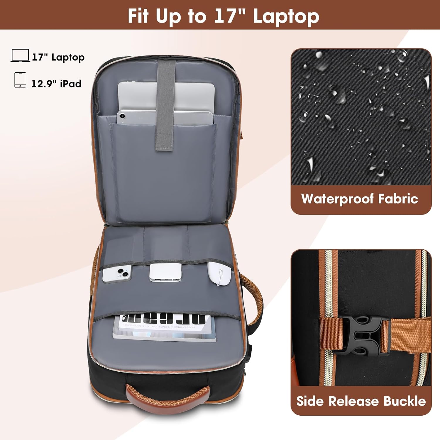 40L Capacity with Laptop Compartment: This extra large backpack offers more packing capacity up to 40L for your travel. Main compartment has enough storage room to store 8 to 10 clothes and daily necessities. It also has built-in elastic bands to keep your clothes from falling out. Elasticated side pockets holds a 32oz water bottle and umbrella pretty well. This luggage backpack is the best choice for women and men's vacation, weekend getaway, overnight and bussiness trip