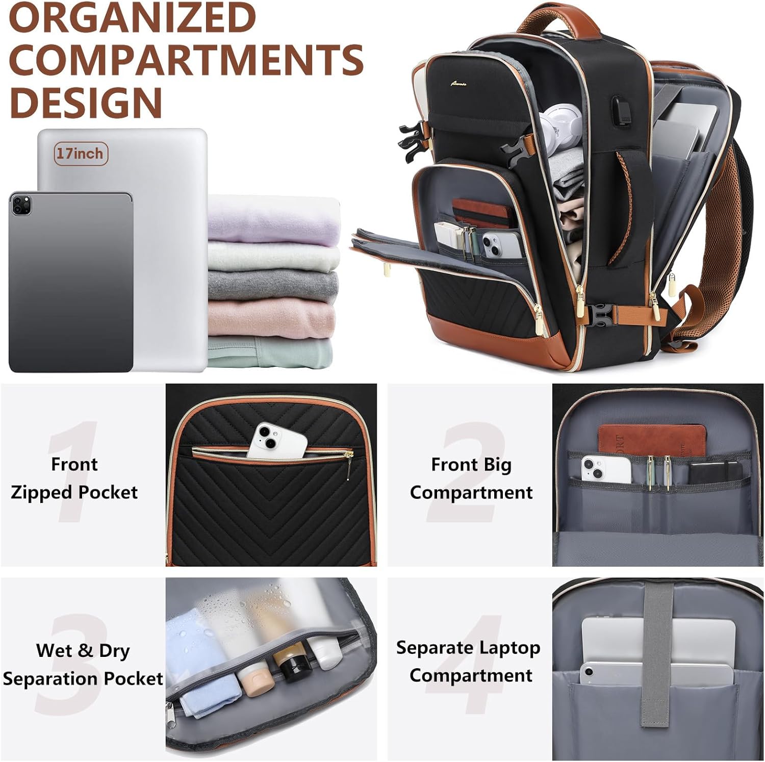 Airline Approved Carry on Backpack: Travel backpack Size information: 18*13*8 inch (L x W x H). Weight:2.4lb. This tsa carry on backpack flight approved and fits under the seat or in the overhead compartment. The laptop compartment on the back and the main compartment can be opened 180 degrees, allowing you to easily pass through security checks without paying extra for the flight. Additionally, the two-way zippers provide added security, making it the perfect personal item for air travel