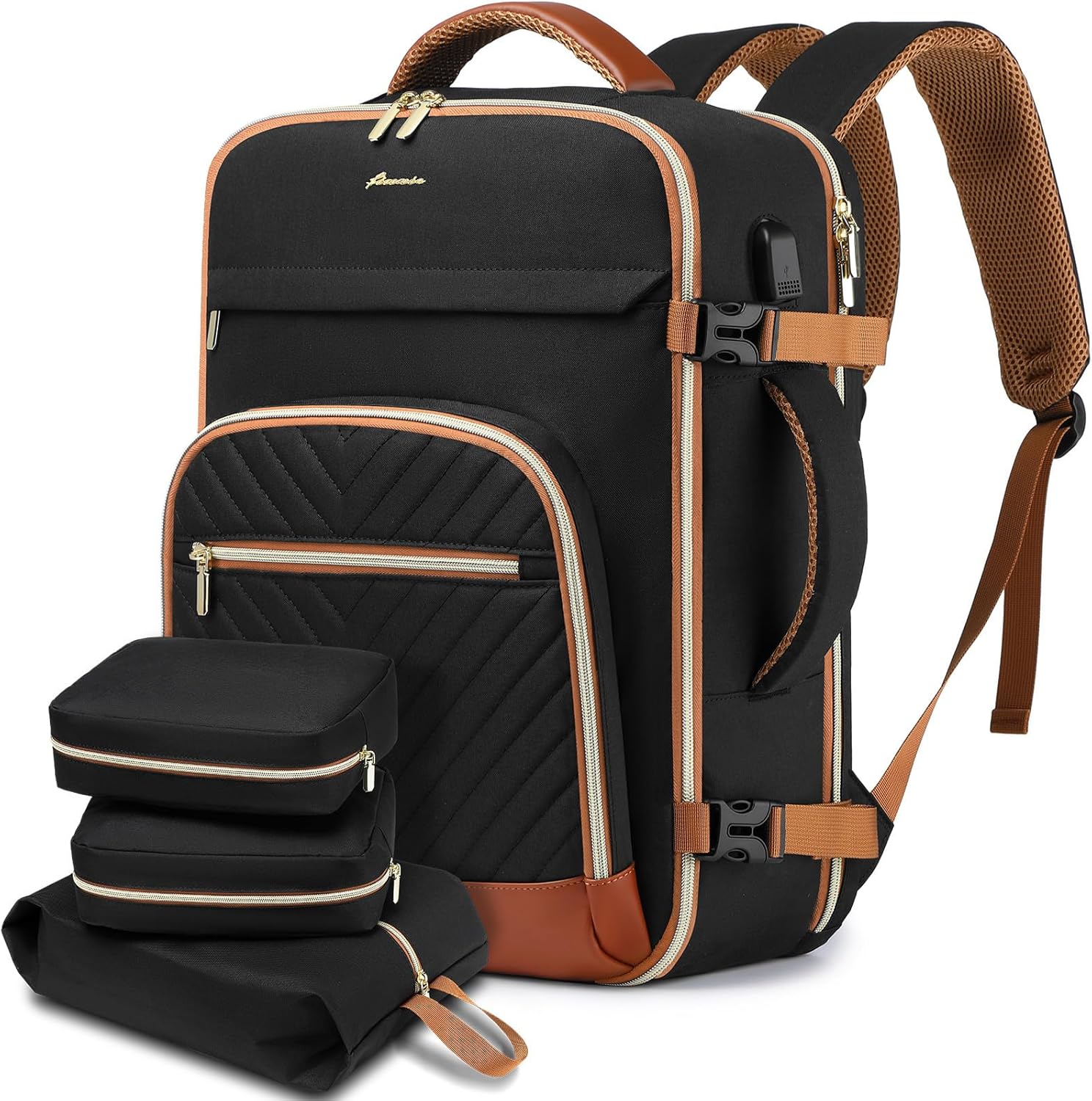 3 Extra Packing Cubes & Wet Pockets: This airport carry on backpack comes with 1 shoe bag, 2 storage bag, One cube bag for toiletries such as makeup, cleanser, etc. One cube bag for underwear, socks, and small clothes neatly inside. The shoe bag is 16.5 inches/42cm long and can hold 1~2 pair of shoes. The built-in dry and wet separation bag to keep your things organized, and you do not worry making your backpack wet. Personal item travel bag convenient for your all travel things
