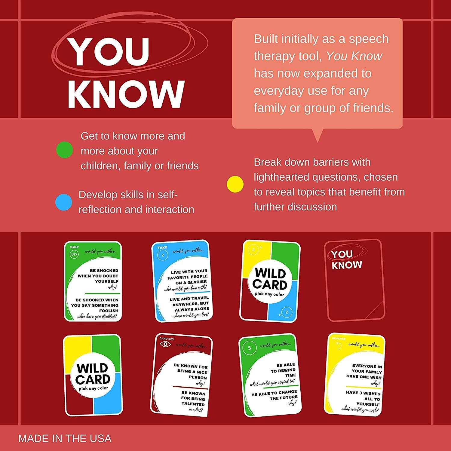 Review: I just got this game and it looks good. If you can play UNO you can play this game. The questions on the cards are simple enough and do promote dialog but until I get a chance to really play it I am going to stick with 4 stars. The questions seem to be random with no real focus on any area of development. I still think they make for an interesting game so only time will tell how I will feel about the game.